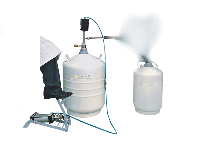 自增压式液氮泵 该产品依靠操作者手捏吸液球(ZYB-5型)或者脚踏气缸(ZYB-8型),使液氮容器内贮存的液氮少量产生气化。由于液氮的气液体积比较大,气化后的氮气在密封的容器内对盛装